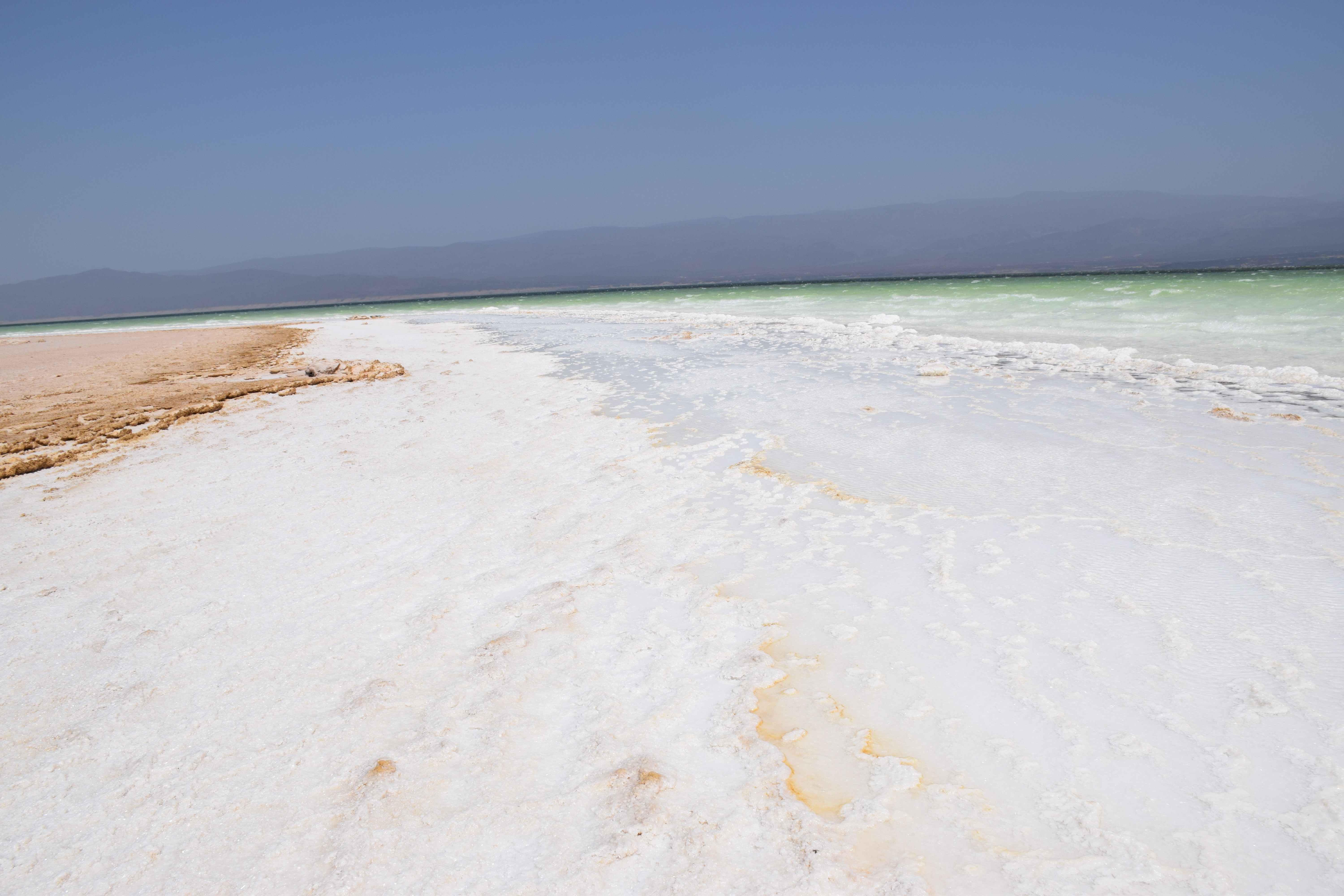 Lake Assal is truly a natural point of interest providing great beauty, within a framework of volcanoes and black lava, 153 m below sea level, abutted with salt and gypsum floes of a dazzling whiteness. Several volcanoes rise up right near the lake, the most recent of which, the Ardoukoba, dates from November, 1978, in a landscape from an absolutely monumental cataclysm. Still, within a few kilometres from there, the boundless bay of Goubet-AL-Kharab, surrounded by vertical cliffs, interconnects with the sea by a narrow channel. This is the bottom of the gulf of Tadjourah, also known as «abyss of the devils».